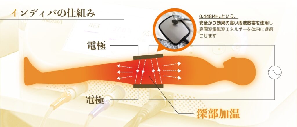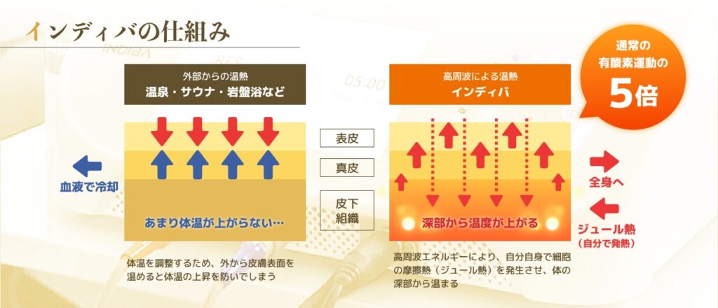 対してインディバの熱源は、ほとんどが体の中で発生して体内にあります。